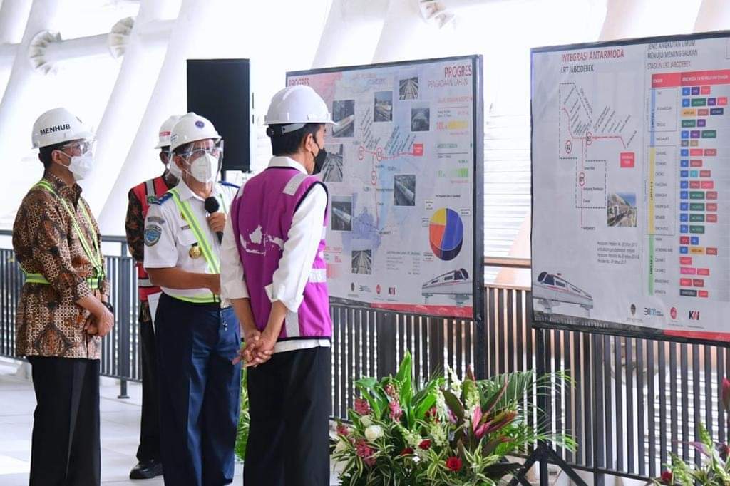 Tiba sekira pukul 08.15 WIB di Stasiun LRT Taman Mini Indonesia Indah (TMII), Jakarta Timur, Presiden Joko Widodo langsung meninjau perkembangan proyek dengan dipandu oleh Direktur Jenderal Perkeretaapian Kementerian Perhubungan, Zulfikri.