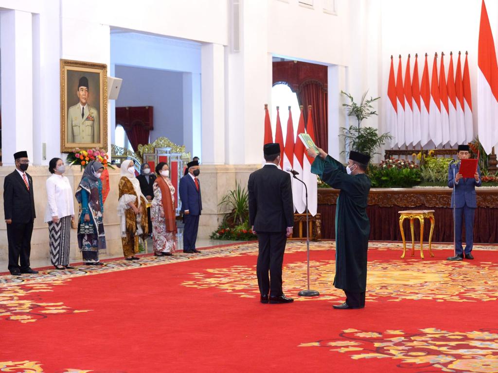Turut mendampingi Presiden dalam pelantikan tersebut yakni Ibu Negara Iriana Joko Widodo dan Wakil Presiden Ma’ruf Amin beserta Wury Ma’ruf Amin.