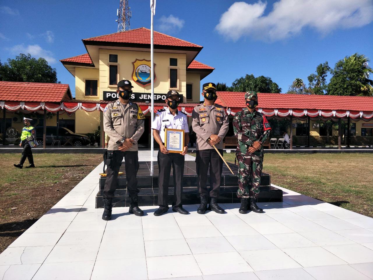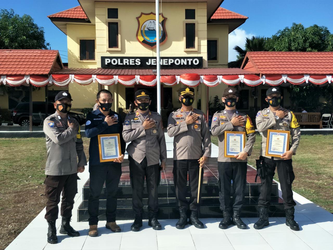 PS. Kasie Humas, Bhabinkamtibmas dan Kepala Desa menerima penyerahan piagam penghargaan dari Kapolres Jeneponto AKBP. Yudha Kesit Dwijayanto, S.H.,S.I.K.