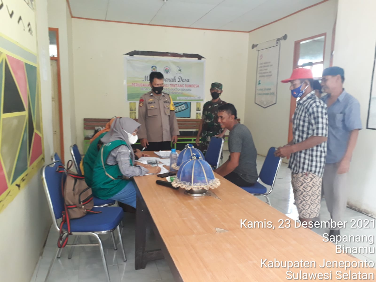 PENJURU. ID | Jeneponto – kegiatan serbuan vaksinasi secara serentak seluruh Indonesia. Desa Sapanang Kecamatan Binamu Kabupaten Jeneponto gelar pemberian vaksinasi bagi warganya, Kamis (23/12/2021)