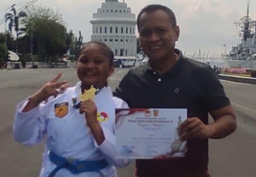 Bocah cantik dan tengil putri dari Aiptu Dodik, yang saat ini masih duduk di bangku SD kelas 6 SDN Sukabumi 2 bernama Putri Dinda Aura Ramadhani, lagi-lagi berhasil menunjukkan prestasinya dengan memboyong medali Emas di ajang Piala Karate Panglima Koarmada RI 2024.