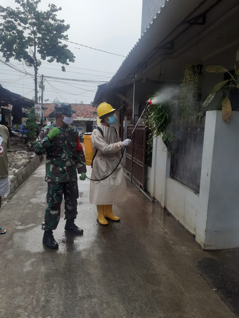 PENJURU.ID | Tangerang – Untuk memutus rantai penyebaran virus Covid-19, anggota Koramil 07/PDA Kodim 0506/Tgr Peltu Jumingin melakukan penyemprotan disinfektan di Kelurahan Pondok Karya Kecamatan Pondok Aren Kota Tangsel, Kamis (15/10/2020).