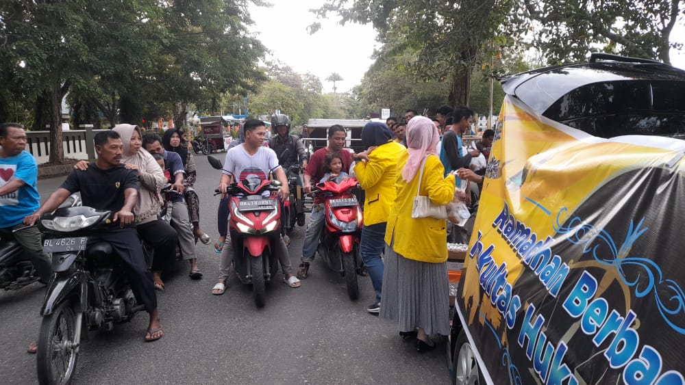 PENJURU.ID | Langsa – Mahasiswa Fakultas Hukum USCND Langsa mengadakan kegiatan sosial dengan berbagi Takjil kepada masyarakat yang melintasi jalan umum Lapangan Belakang tepatnya di depan Pengadilan Negeri Kota Langsa, Jl. Darussalam, Gampong Jawa, Kec. Langsa Kota, pada Jum’at (15/4/22) pukul 16.00 wib.