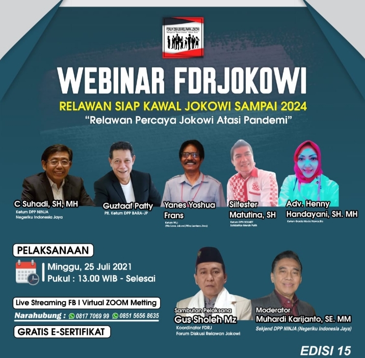 PENJURU.ID | Banten – Para Relawan dan Pendukung Jokowi kembali menggelar Diskusi Virtual lewat Zoom Meeting, Pada Hari Minggu (25/07/2021) Siang. Acara kali ini bertajuk “Relawan Percaya Jokowi Atasi Pandemi” para relawan dan pendukung Jokowi ini dalam diskusi tersebut kembali menyamakan persepsi, serta wujud dukungan mereka terhadap pemerintah Jokowi dalam mengatasi pandemi Covid-19.