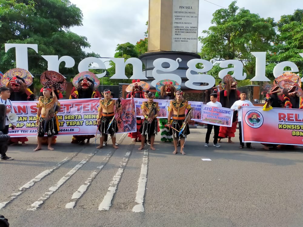 PENJURU.ID | Trenggalek – Generasi muda suket teki mengadakan kegiatan mendukung kebijakan pemerintah dalam penyesuaian harga BBM yang di gelar depan garuda Alun-Alun Trenggalek. Sabtu (17/09/2022).