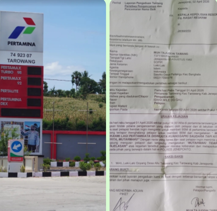 PENJURU. ID | Jeneponto – Dugaan intimidasi terhadap wartawan di SPBU Tarowang kini resmi masuk ke ranah hukum. Seorang warga berinisial DG dilaporkan ke Polres Jeneponto atas dugaan pengancaman.