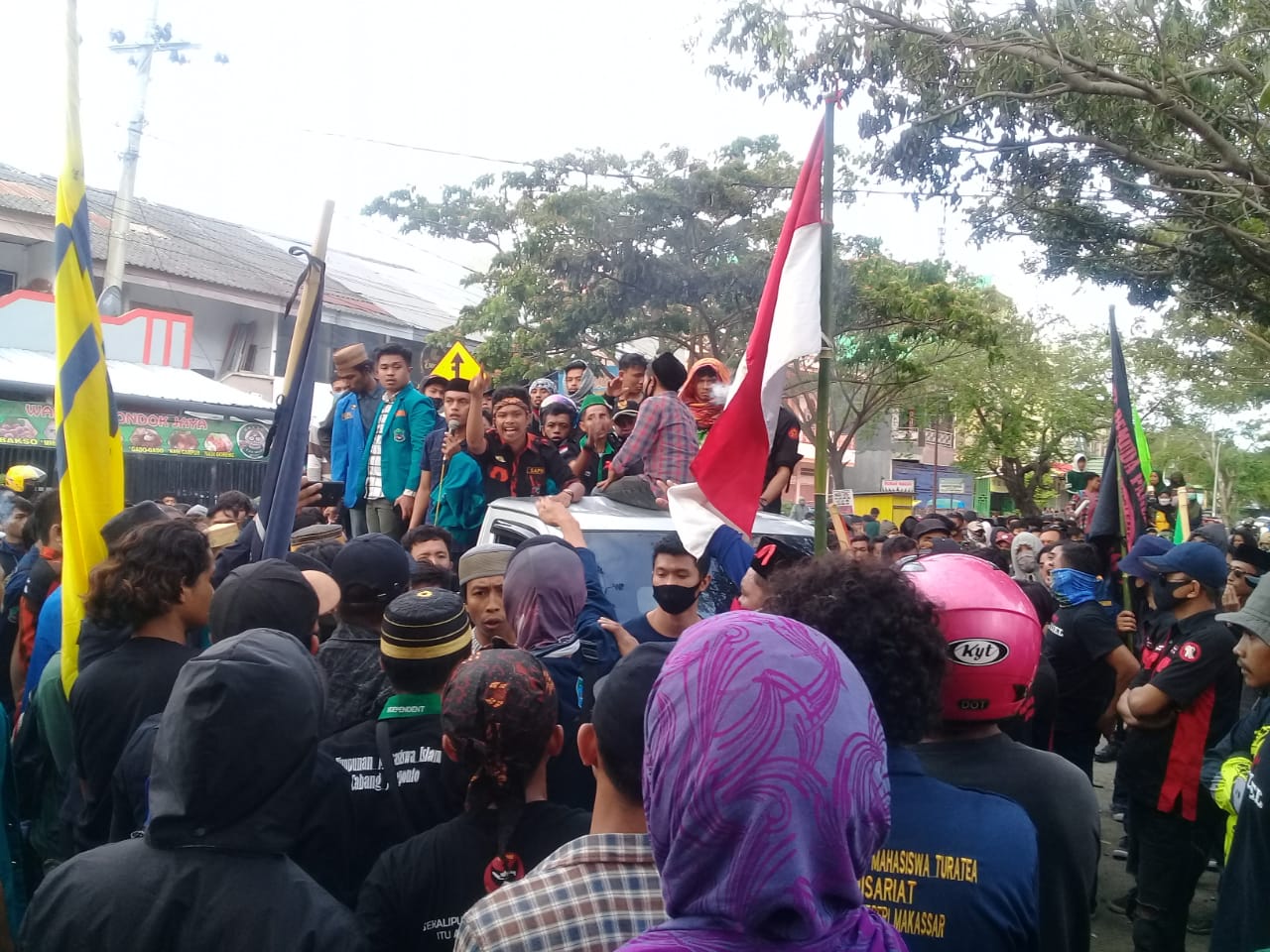 Dalam aksinya, mahasiswa menggunakan pasilitas sejumlah bendera organisasi dikibarkan dan beberapa lainnya sebagai bentuk persatuan dalam menolak UU Umnibus Law.