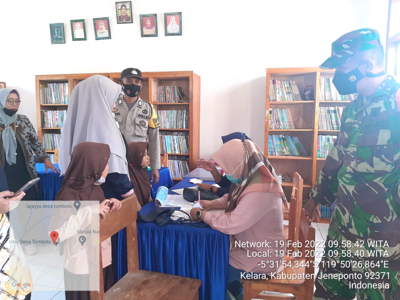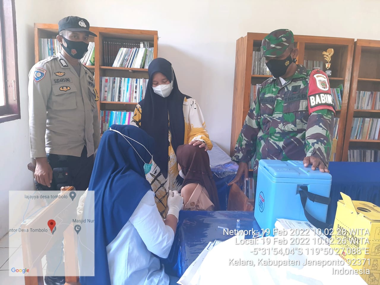 Dalam rangka percepatan vaksinasi bagi semua kategori umur, Jajaran kepolisian turut mendukung pelaksanaannya seperti terlihat di desa tombolo.