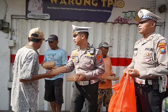 PENJURU.ID | Probolinggo – Puluhan petugas dari Satuan Lalu Lintas Polres Probolinggo Kota terlihat sibuk bergerak di sekitar Pasar Baru Kota Probolinggo. Mereka tengah melaksanakan kegiatan “Jumat Berkah,” yang merupakan program sosial dengan membagikan 200 porsi nasi kotak kepada tukang becak, tukang parkir, dan warga yang melintas di area tersebut.