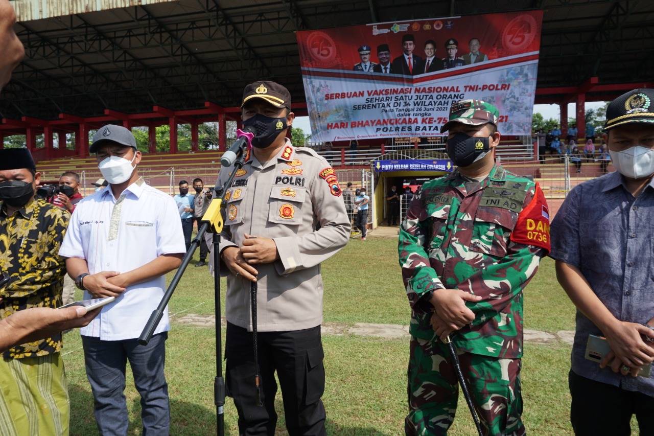 “Polri dalam rangka menyambut Hari Bhayangkara ke-75 menggelar serbuan vaksinasi serentak. Untuk jajaran Polres Batang, kami melakukan vaksinasi untuk 4.100 warga yang digelar di 10 Polsek dan Koramil serta GOR M Sarengat,” kata Kapolres Batang AKBP Edwin Louis Sengka didampingi jajaran Forkopimda usai meninjau proses vaksinasi di GOR M Sarengat, Sabtu (26/6/2021).