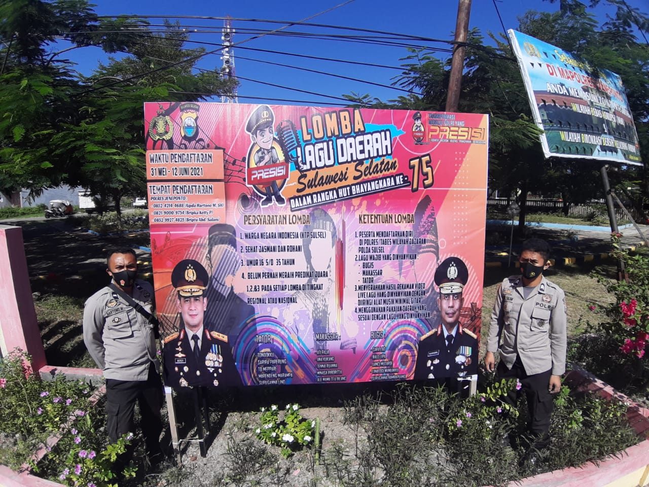 “Personil Polres Jeneponto melaksanakan pemasangan baliho lomba lagu Daerah Sulawesi Selatan sekaligus sosialisasi lomba lagu Daerah dalam rangka memeriahkan HUT Bhayangkara ke-75.”ujar Syahrul.