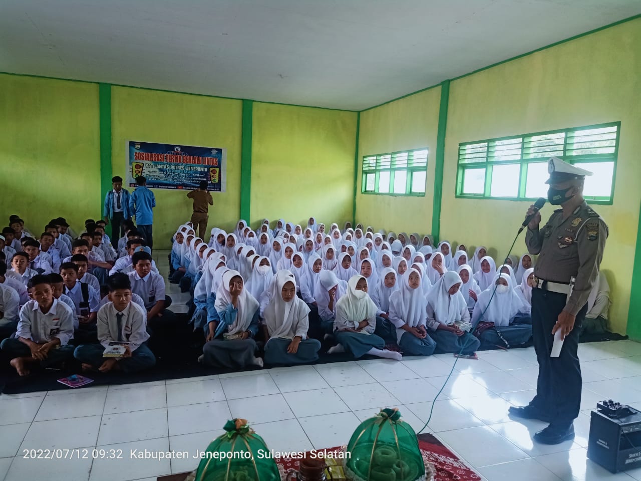 PENJURU. ID | Jeneponto – Kasat Lantas Polres Jeneponto yang diwakili oleh Kbo Sat Lantas Iptu Sudirman, M, SH melaksanakan kegiatan sosialisasi Undang-undang no. 22 tahun 2009 tentang Lalu lintas dan angkutan jalan terkait pam arus lalu lintas di jalan.