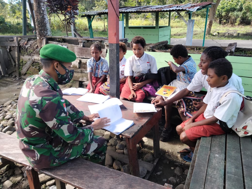 PENJURU.ID | Keerom – Kepedulian anggota Pos Waris Satgas Pamtas RI-PNG Yonif Mekanis 512/QY dalam upaya meningkatkan ilmu pengetahuan dan minat baca bagi anak-anak di perbatasan RI-PNG dibuktikan melalui konsistensi yang terus melakukan bimbingan belajar kepada anak-anak di wilayah perbatasan Papua.