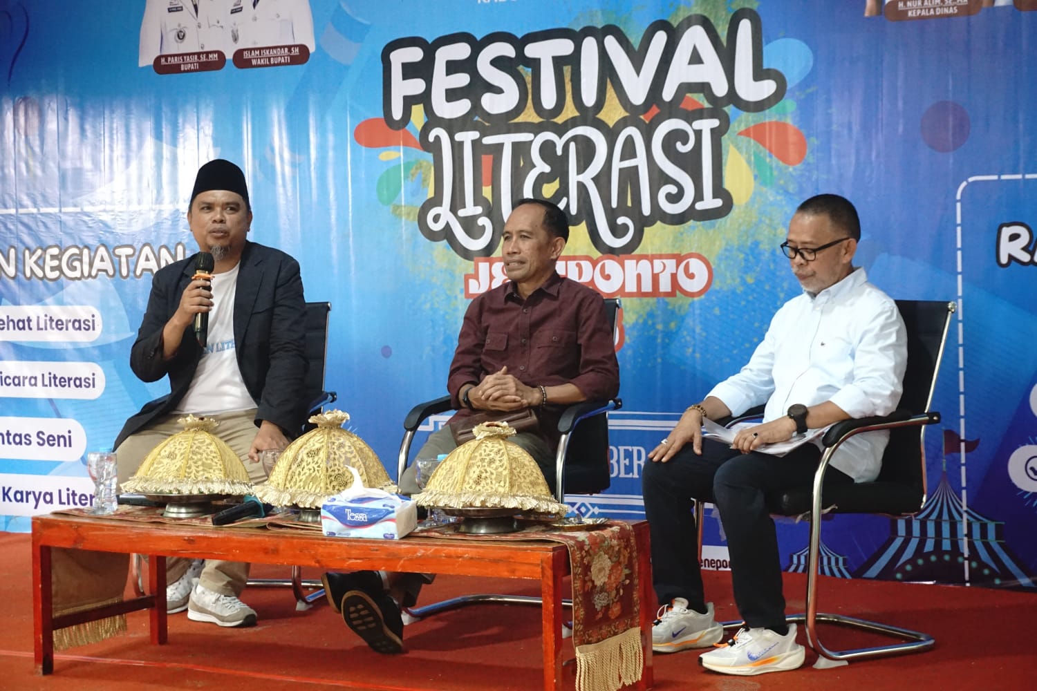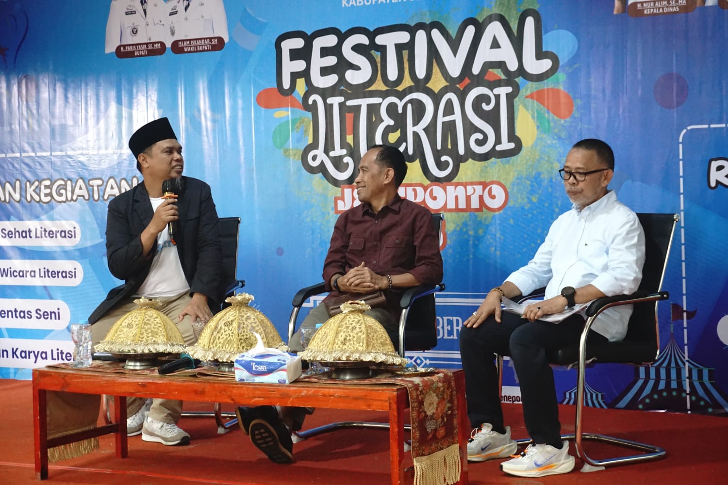 Diskusi literasi tersebut dipandu oleh Haerullah Lodji dan menghadirkan dua narasumber utama: Dr. Bahtiar Adnan Kusuma, tokoh literasi nasional, serta Prof. Muhlis Hadrawi, akademisi dan pemerhati sastra Sulawesi Selatan.