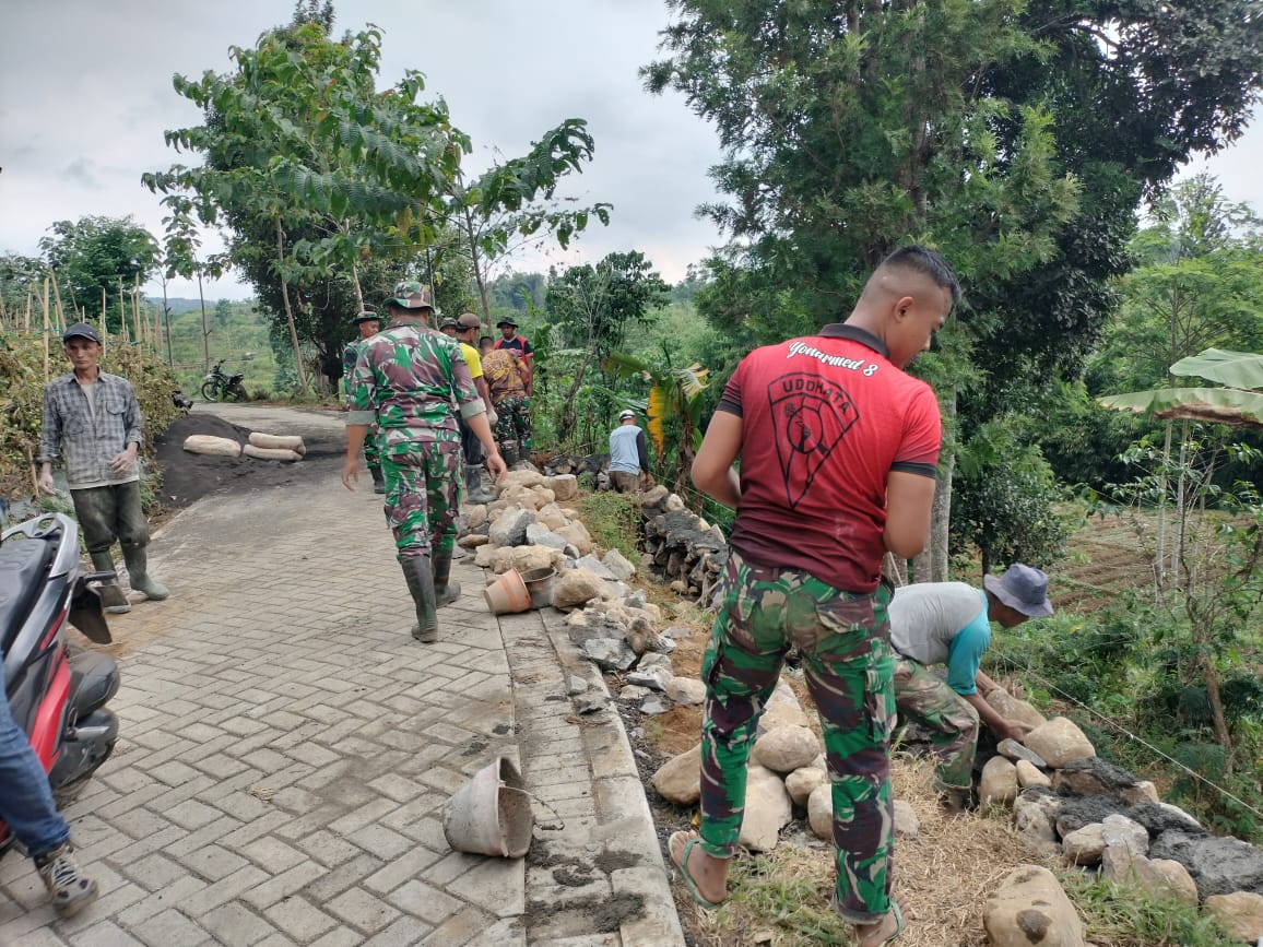 PENJURU.ID | Probolinggo – Satgas TMMD ke 121 Kodim 0820/Probolinggo tahun 2024 bersama masyarakat Dusun Cocok, Desa Kalianan, Kecamatan Krucil dengan semangat gotong royong terus mengerjakan pembangunan plengsengan di sisi jalan desa setempat.