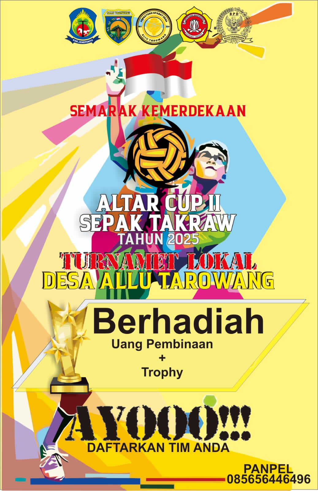 PENJURU. ID | Jeneponto – Dalam rangka memeriahkan Hari Kemerdekaan Republik Indonesia, Pemerintah Desa Allu Tarowang bersama panitia penyelenggara bakal menggelar Turnamen Sepak Takraw Altar Cup II Tahun 2025. Kegiatan olahraga ini diadakan sebagai ajang silaturahmi sekaligus wadah penyaluran bakat dan minat pemuda di bidang olahraga tradisional.