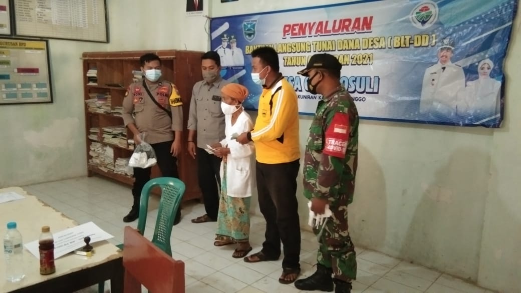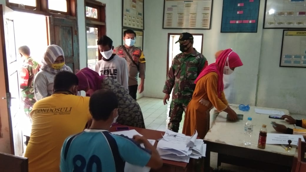 PENJURU.ID | Probolinggo – Batituud Koramil 0820/17 Pakuniran memantau dan mengawal pelaksanaan penyaluran bantuan langsung tunai dana desa (BLT DD) di Kantor Desa Gondosuli Kecamatan Pakuniran Kabupaten Probolinggo. Senin, (5/7/2021)