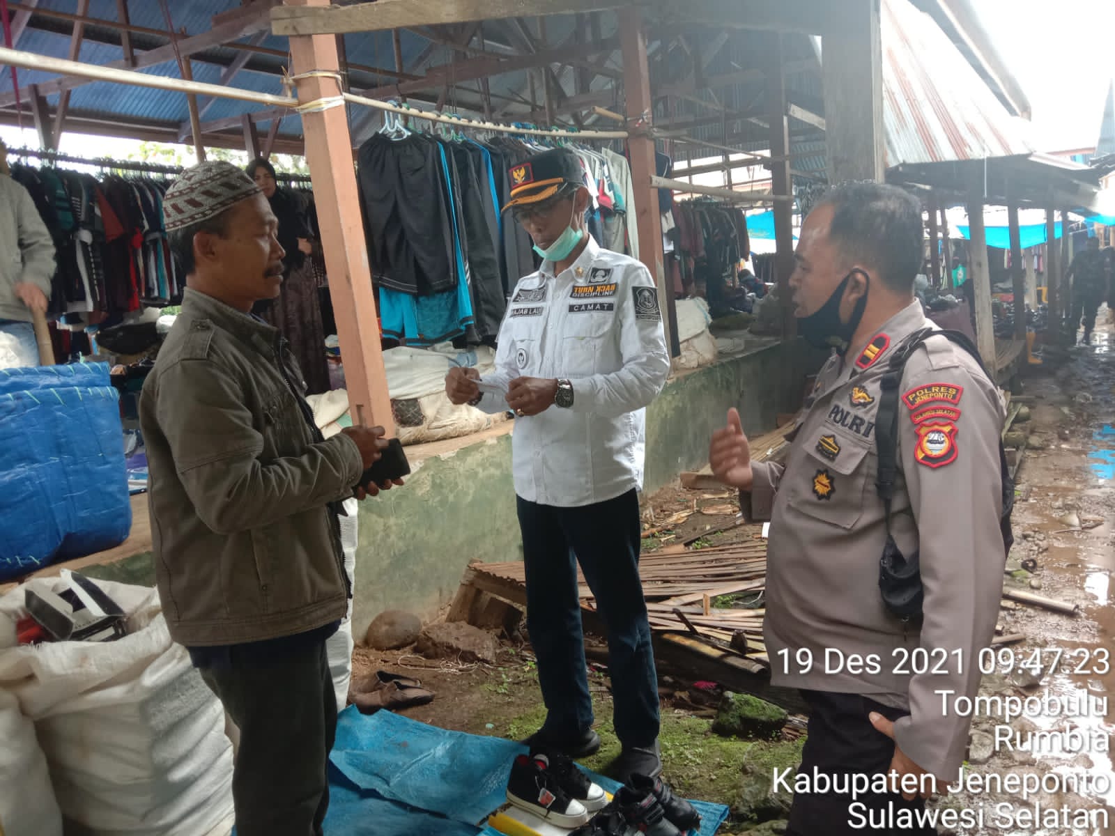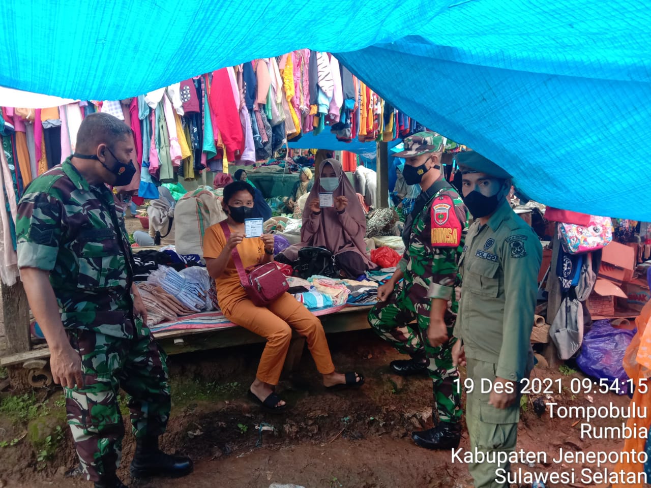PENJURU. ID | Jeneponto – Tripika Rumbia sidak pasar Tradisional Boro Desa Tompobulu minta kepada pedagang dan pengunjung pasar perlihatkan kartu vaksin, Minggu (19/12/2021)