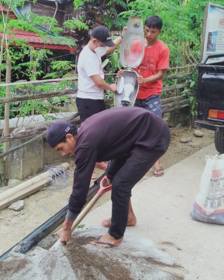 “Usai meninjau lokasi selang waktu 3 hari sesudah pelantikan saya lansung memberikan fasilitas penerangan jalan buat warga sebanyak 6 unit lampu jalan.”