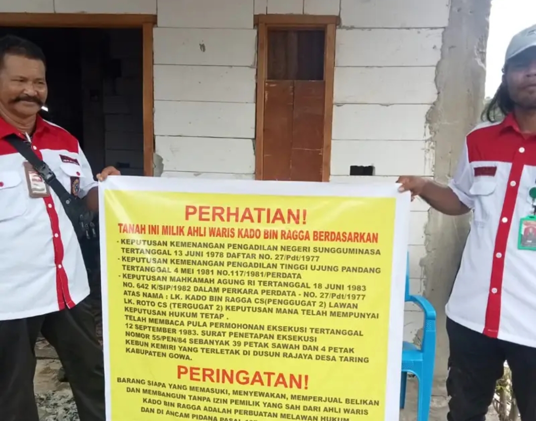 Papan pengumuman tersebut dipasang sebagai bentuk penegasan status hukum lahan yang diklaim sebagai milik ahli waris Kado Bin Ragga, berdasarkan putusan pengadilan yang telah berkekuatan hukum tetap (inkracht).