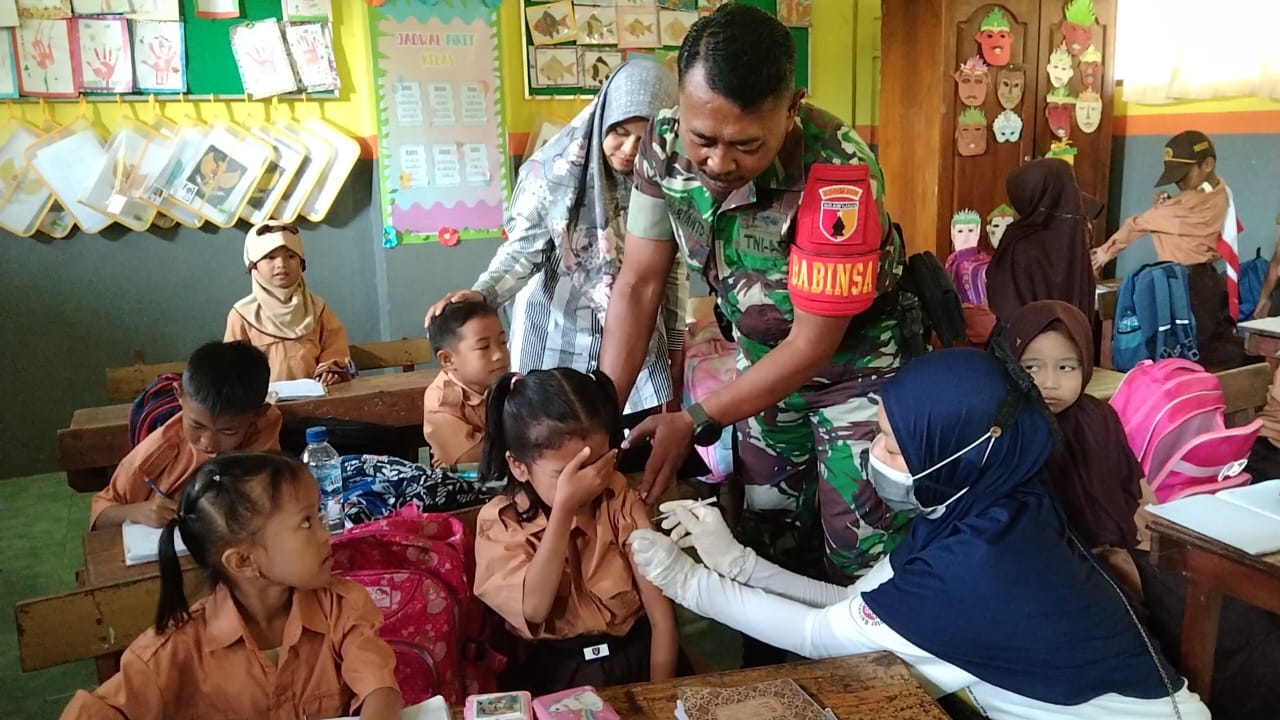 PENJURU.ID – Probolinggo – Sebagai upaya mendukung Suksesnya Program Bulan Imunisasi Anak Sekolah (BIAS), Sertu Suharianto Babinsa Koramil 0820/04 Bantaran melaksanakan giat pendampingan penyaluran imunisasi kepada siswa SDN Patokan 1 di desa Patokan Kecamatan Bantaran Kabupaten Probolinggo, Sabtu (09/09/2023)