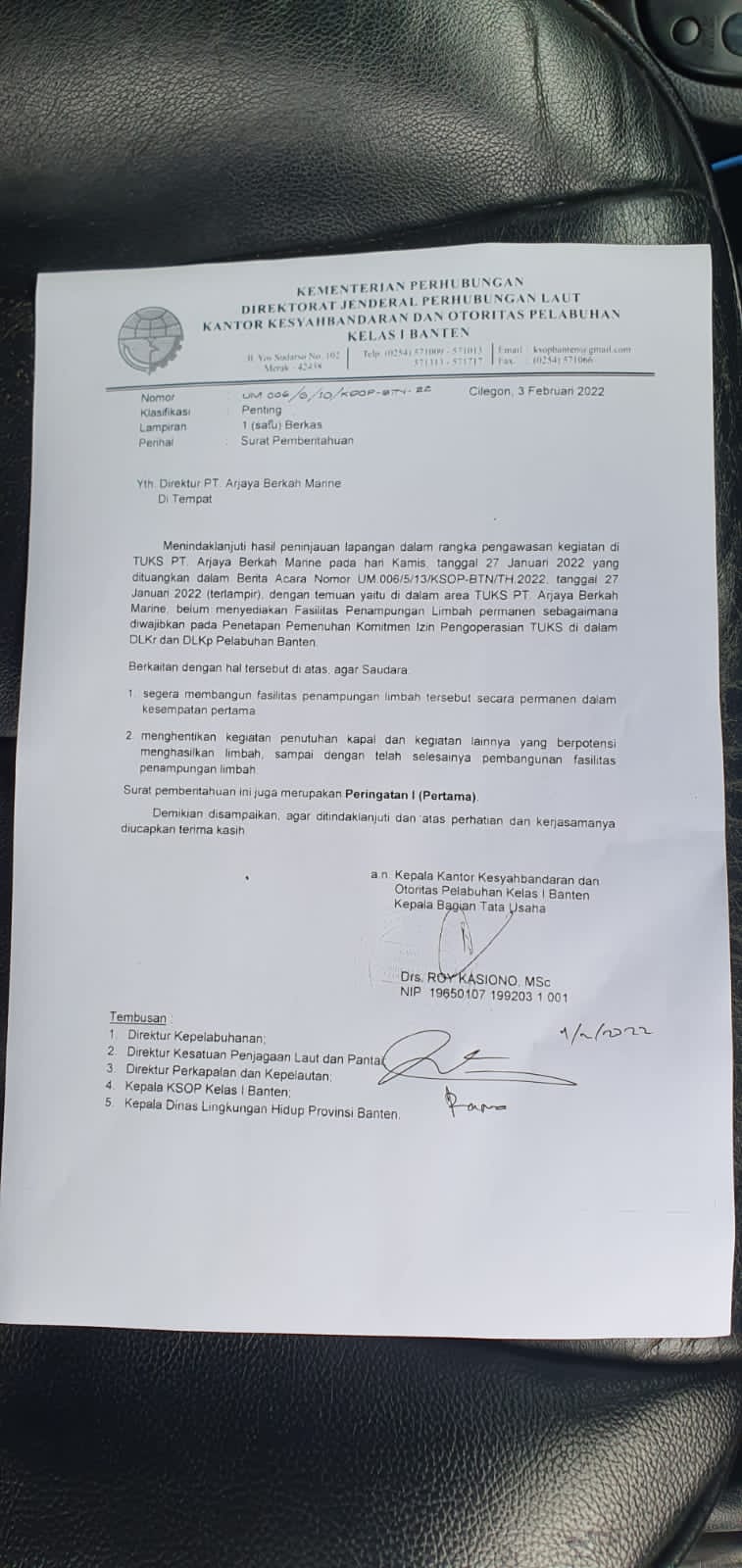 Kabupaten Serang. Tuntutan ke Kantor Kesyahbandaran Otoritas Pelabuhan (KSOP) Kelas 1 Banten dari gabungan Lsm dan Ormas yang ada di kota Cilegon terkait pemberhetian kegiatan pemotongan kapal di PT.Arjaya Berkah Marine (ABM) dipenuhi pihak KSOP Banten, di ketahui bahwa pihak KSOP kelas 1 Banten telah memberikan surat himbauan untuk memberhentikan kegiatan pemotongan kepada PT.ABM pertanggal 3 januari 2022.