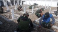 Peringati HUT ke-77 RI, Kodim 0117/Aceh Tamiang Bersama DLHK dan Ormas Gotong Royong Bersihkan Makam Pahlawan