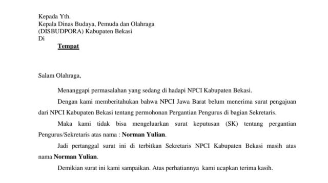 Terbitkan Surat Pemberitahuan Dari NPCI Jabar, Norman Yulian Masih Sah Jabat Sekretaris NPCI Kabupaten Bekasi