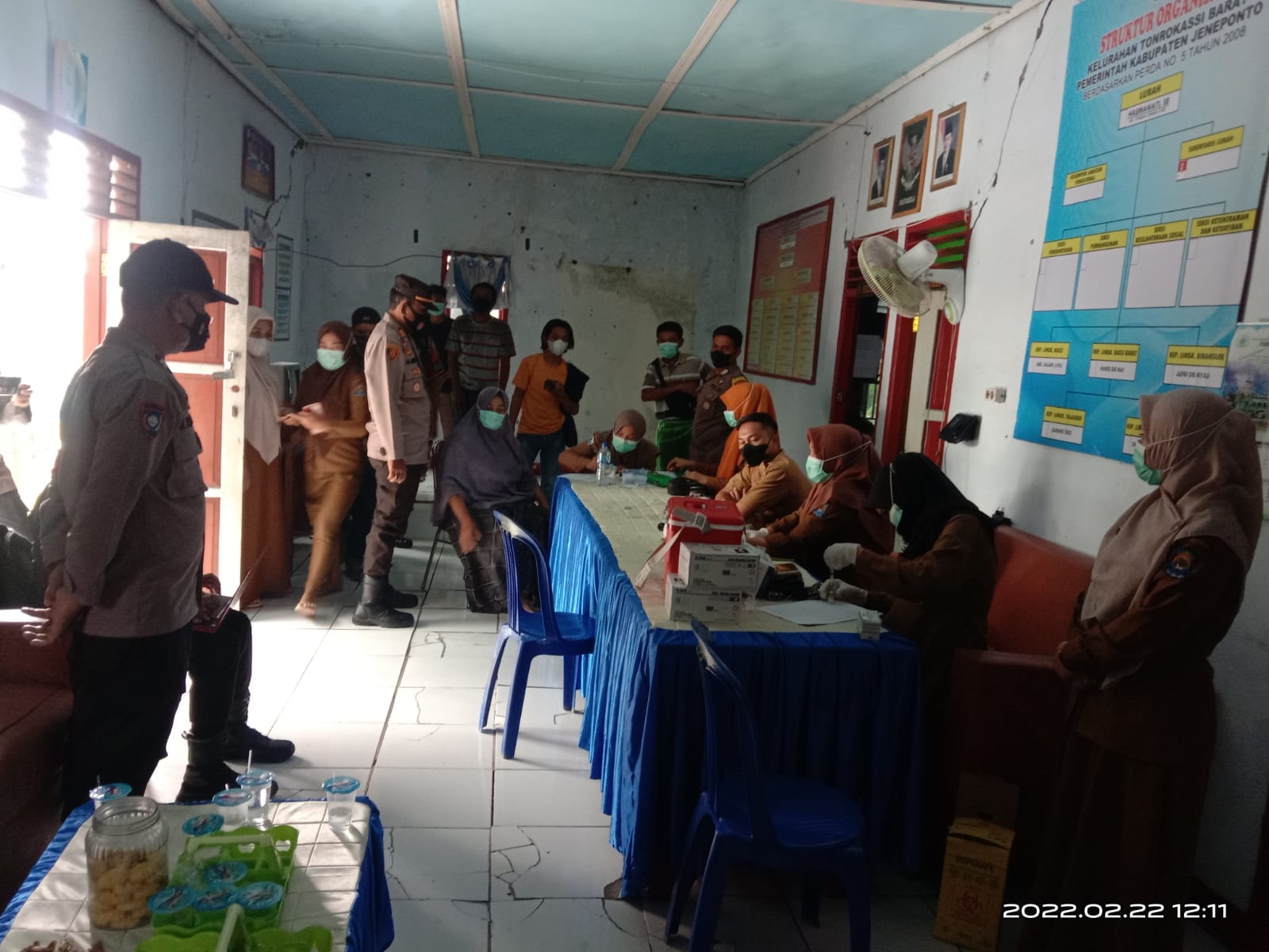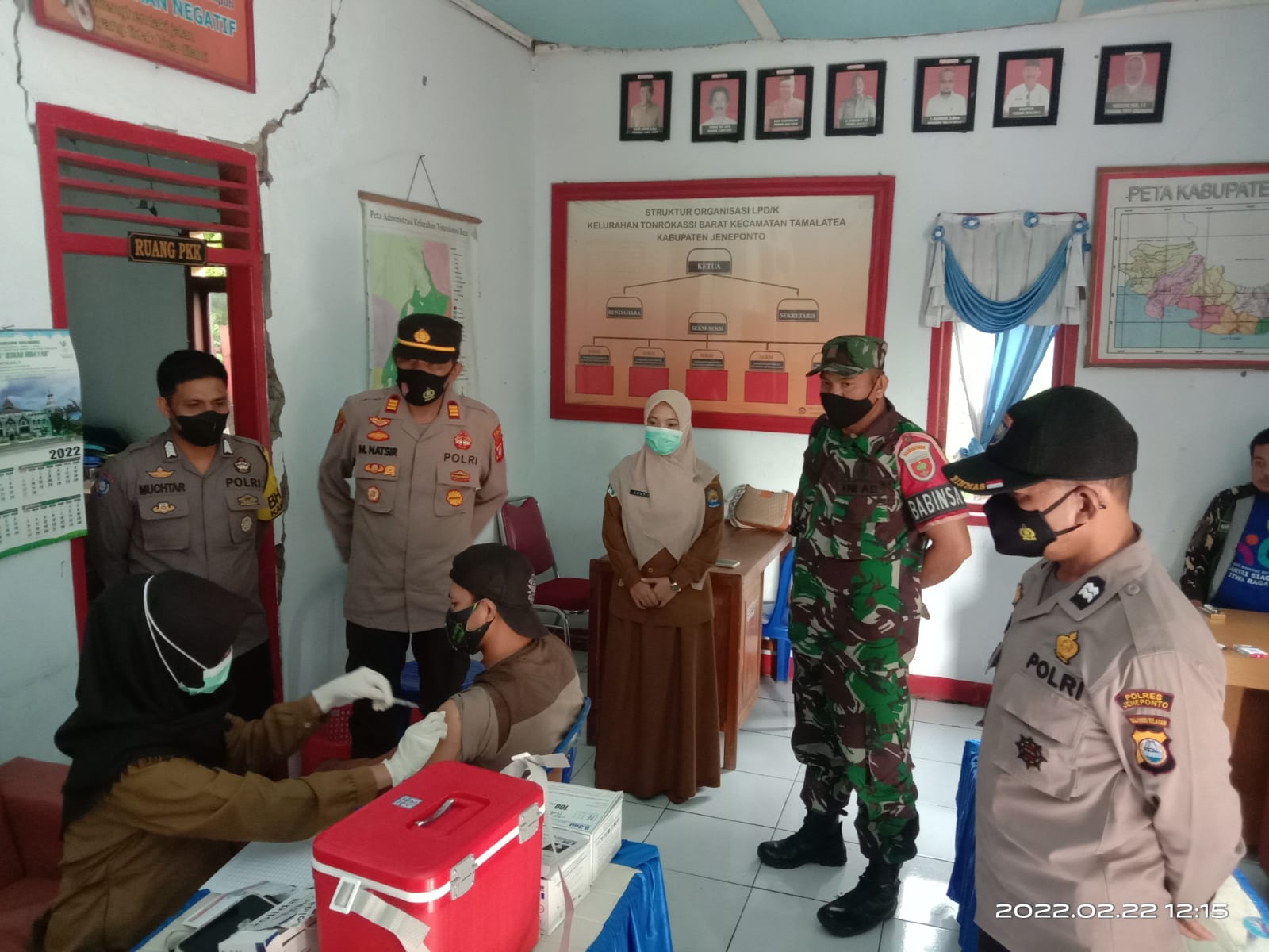 PENJURU. ID | Jeneponto – Bhabinkamtibmas Bripka Muhtar dan Babinsa Kopda Syamsuddin memantau pelaksanaan vaksinasi di Kantor Kelurahan Tonrokassi Barat Kecamatan Tamalantea, Sabtu (19/2/2022)