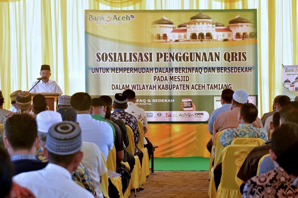 Sementara itu, Pimpinan PT. Bank Aceh Syari’ah Cabang Kuala Simpang M. Syah mengucapkan terima kasih kepada Imam dan Pengurus Masjid yang telah hadir, dan dalam kesempatan ini juga akan ada pembagian celengan kotak amal yang berbasis teknologi dengan menggunakan QRIS.