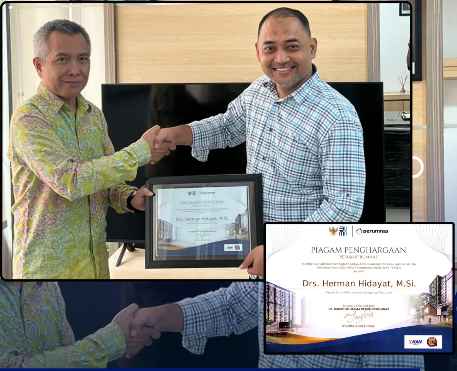 “Penghargaan ini menjadi bukti nyata kolaborasi yang kuat antara instansi pertanahan dan BUMN sektor perumahan dalam mendorong tertib administrasi serta percepatan layanan pertanahan,”kata Kepala Kantor Pertanahan Kabupaten Pasuruan, Drs. Herman Hidayat, M.Si.,
