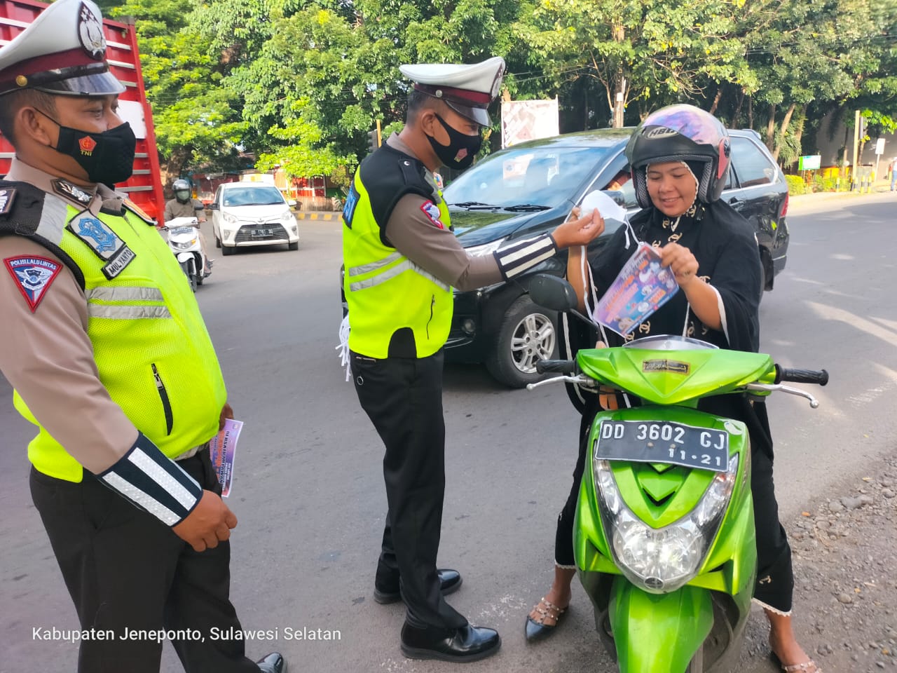 Pelaksanakan kegiatan rutin setiap pagi dipimpin langsung Kasat Lantas AKP Syaharuddin tentang sosialisasi penerapan protokol kesehatan terutama dalam berkendara serta membagikan masker kepada masyarakat pengguna jalan yang melintasi di jalan Sultan Hasanuddin tepatnya depan Mapolres Jeneponto, Kamis (14/4/2022)