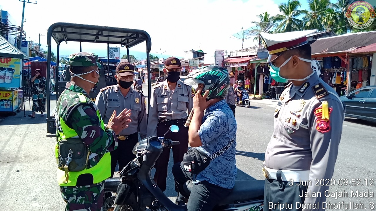 PENJURU.ID | Agam – Personil TNI dan POLRI Kabupaten Agam Provinsi Sumatera Barat lakukan kegiatan Gabungan dalam rangka Pendisiplinan masyarakat untuk mematuhi protokol kesehatan menuju New Normal guna antisipasi dan memutus mata rantai penularan Virus Carona/Covid – 19 di Wilayah hukum Polres Agam.
