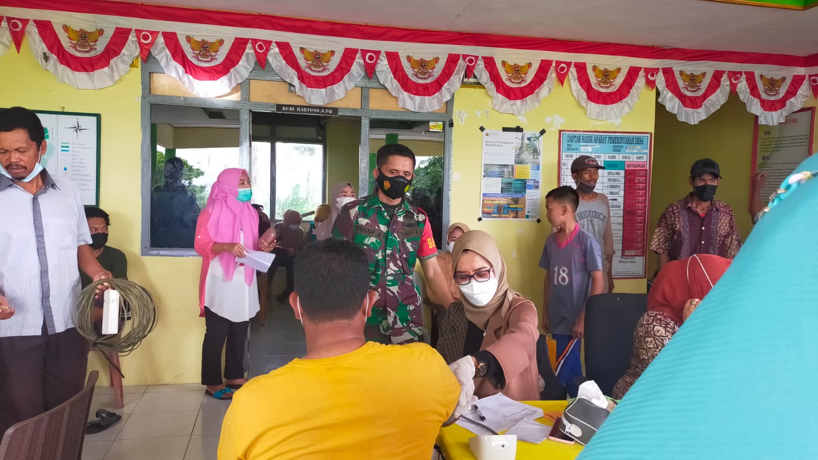 Dalam kegiatan tersebut dihadiri, Danramil 1425-01/Bnm ( Kapten Inf Azis.L, S.Sos, Camat Turatea Syamsul.A, Masyarakat Peserta vaksin