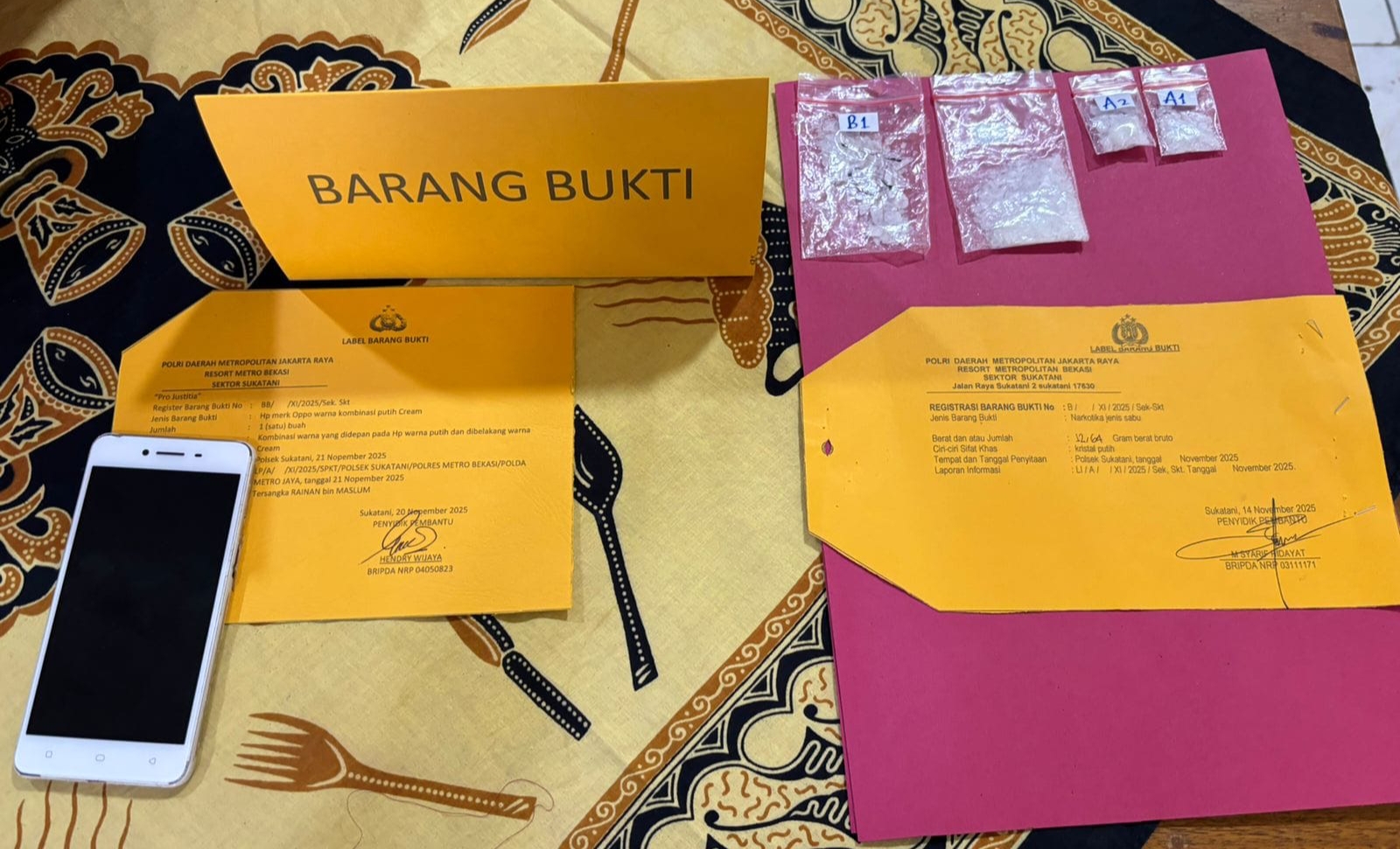 “Saat dilakukan penggeledahan, pelaku sempat membuang sebuah plastik hitam ke arah plafon rumah. Ketika diperiksa, plastik tersebut berisi tisu yang membungkus beberapa klip bening berisi sabu-sabu,” ungkapnya, Jumat (21/11/2025)
