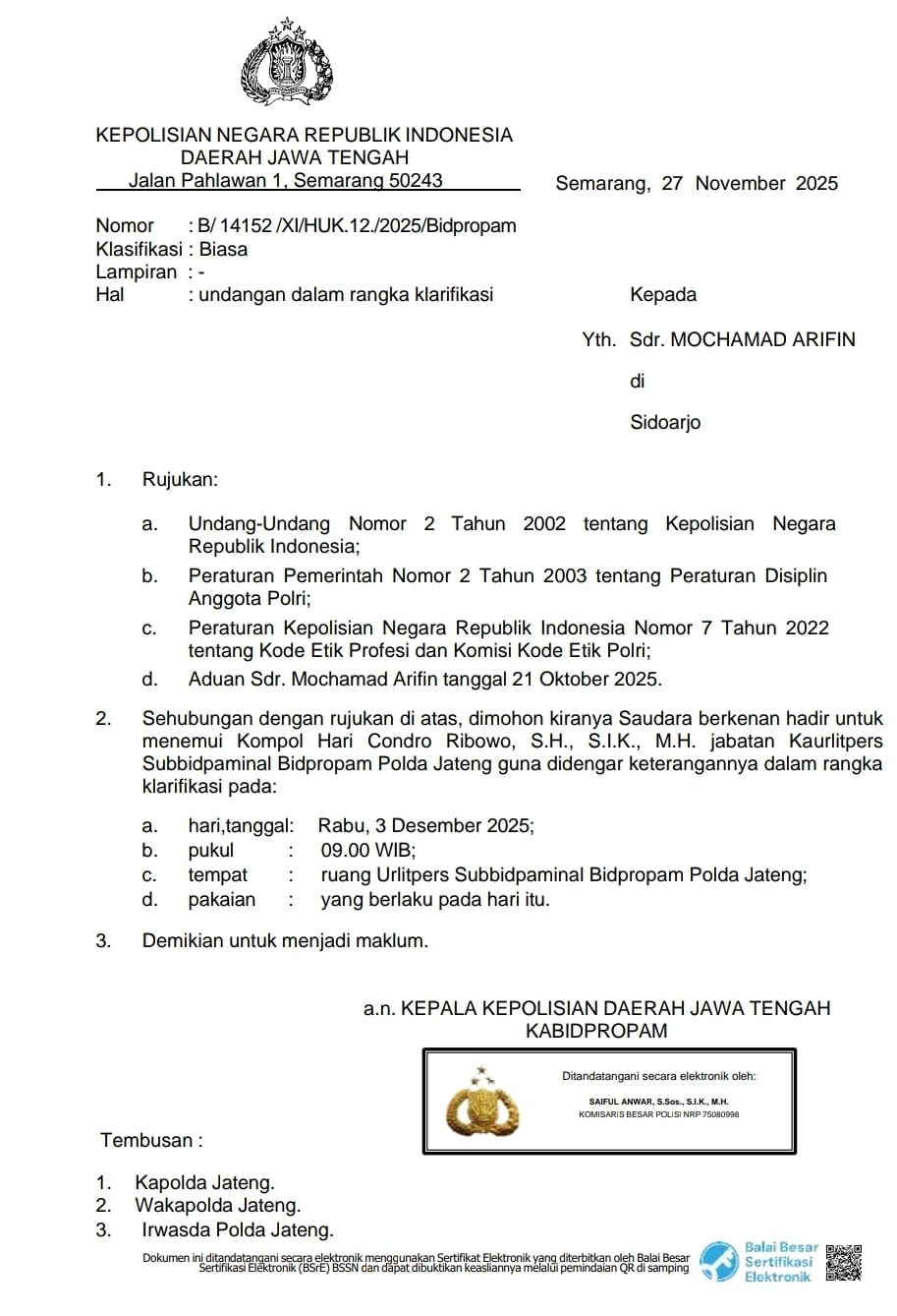 Besok Rabu 3 Desember 2025. Saya diminta oleh klien saya ( pelapor ) yaitu M. ARIFIN untuk mendampingi beliau hadir untuk diperiksa di ruang Urlitpers Subbidpaminal Bidpropam Polda Jateng pk. 09.00 Wib Pagi.