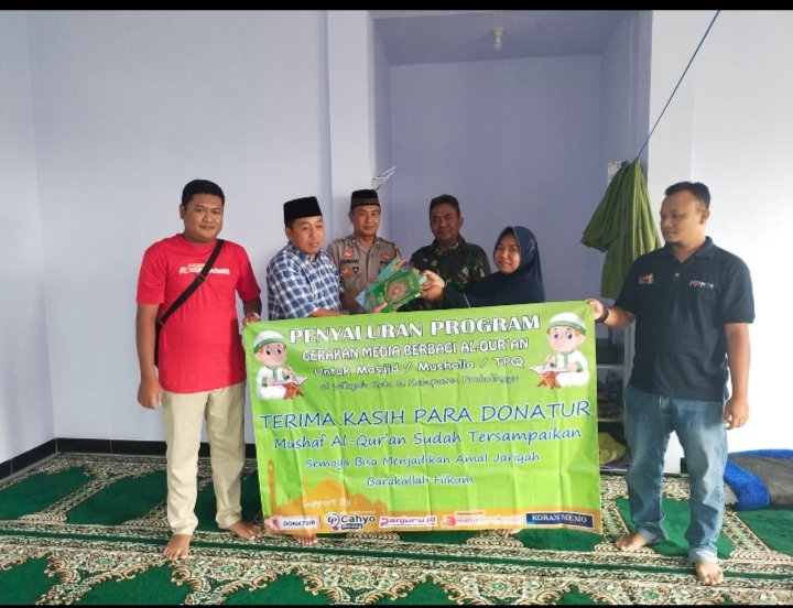 Dengan didampingi Sertu Wahyudi beserta Aiptu Ichkwan, sejumlah awak media dari penjuru.id, wartademokrasi.id, beserta Koran memo menyerahkan Al-Qur’an yang diterima langsung oleh Sudarko selaku takmir musholla setempat.