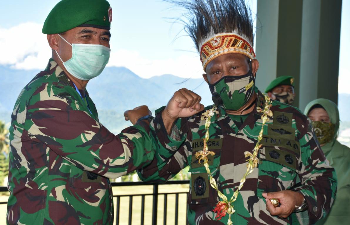 PENJURU.ID, Manokwari,kasuari18 – Pemasangan topi adat dan penyerahan panah tradisional oleh tokoh adat suku Arfak Obeth Ayokh mengawali tradisi penyambutan Panglima Kodam (Pangdam) XVIII/Kasuari yang baru, dilanjutkan arakan Pangdam dengan iringan lagu “Selamat Datang”, kemudian Pangdam menerima laporan pos jaga dan hormat jajar personel dinas jaga kesatriaan serta pedang pora para Perwira Pertama dan penciuman Pataka Kodam XVIII/Kasuari “Patriot Pembela Rakyat”, mewarnai suasana tradisi penyambutan terhadap putra Kaimana, Papua Barat, Mayjen TNI Ali Hamdan Bogra S.I.P., M.Si dan ibu Retno Ali Hamdan Bogra sebagai Pangdam XVIII/Kasuari dan Ketua Persatuan Istri Tentara (Persit) Kartika Chandra Kirana (KCK) Pengurus Daerah (PD) XVIII/Kasuari yang baru, Jumat (15/5/2020) di Markas Komando (Mako) Kodam XVIII/Kasuari, Arfai 1, Kabupaten Manokwari, Provinsi Papua Barat.