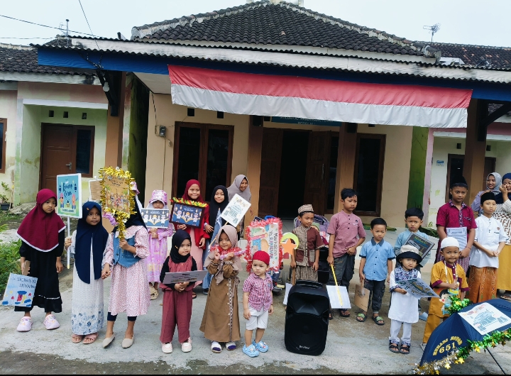 Dengan mengenakan busana muslim sambil membawa atribut ucapan selamat datang Ramadan para anak anak antusias dengan penuh kegembiraan.