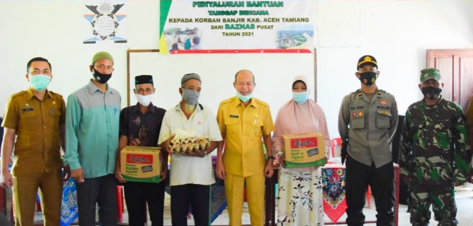 PENJURU.ID | Aceh Tamiang – Bertempat di TPQ Rantau Pakam Bupati Aceh Tamiang H. Mursil, SH, M.Kn didampingi oleh Kepala Baitul Mal, Mulkan Tarida Tua Tampubolon, S.PdI, LC, M.Hi dan Camat Bendahara, Fakhrurrazi Syamsuyar, S.STP memberikan Bantuan Tanggap Bencana kepada korban banjir Kabupaten Aceh Tamiang dari Badan Amal dan Zakat Nasional (Baznas) Pusat secara simbolis, Selasa (09/03/21).