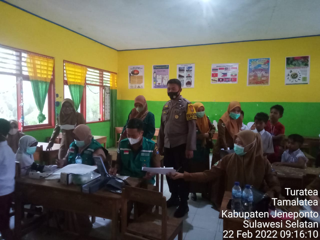 Bhabinkamtibmas Aipda Abd Rahim bersama Babinsa Serda Rahmat hadir memantau pelaksanaan vaksinasi covid19 dosis tahap I kepada murid SDI 146 baraya yang diselenggarakan oleh pihak sekolah bekerjasama dengan puskesmas tamalatea, Selasa (22/2/2022)