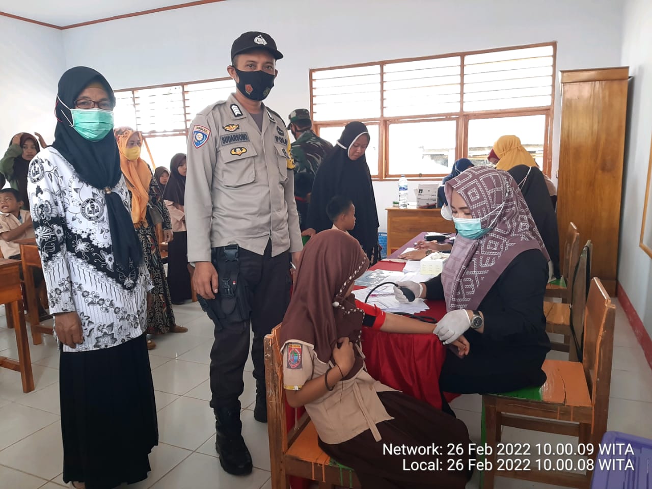 Bhabinkamtibmas Bripka Sudarsono hadir memantau pelaksanaan vaksinasi covid-19 dosis I dan II untuk kategori anak umur 6-11 tahun dosis I dan II yang dilaksanakan di UPT SD Neg No.11 kelara oleh tim puskesmas tolo terhadap anak umur 6 – 11 tahun, Sabtu (26/2/2022)