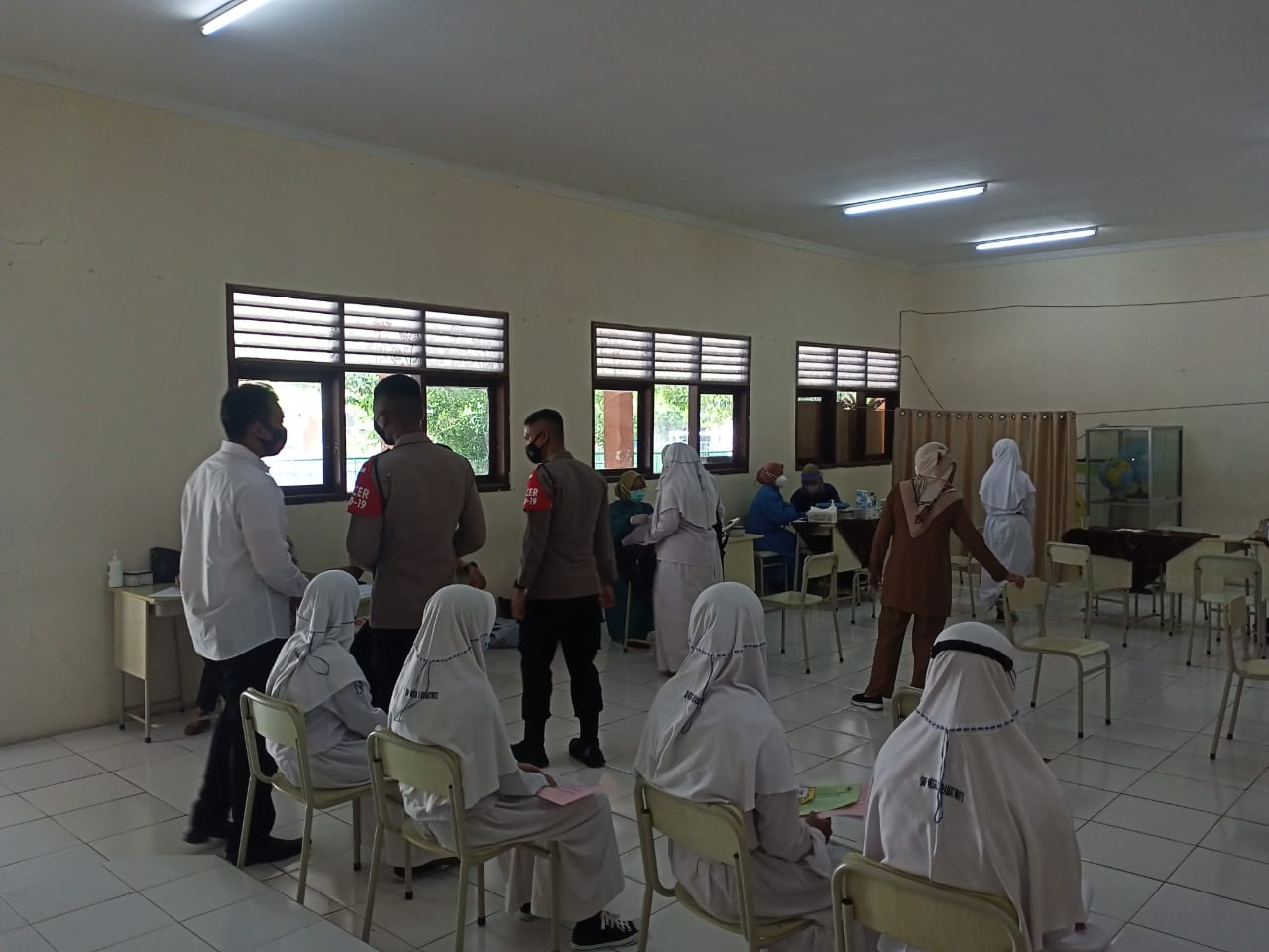 KOTA SERANG, penjuru. Id | jajaran Polsek Kramatwatu Polres Serang Kota Polda Banten amankan jalannya penyuntikkan vaksinasi dosis pertama bagi pelajar di SMP N 3 Kramatwatu, Senin (23/8/2021).