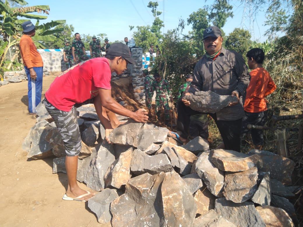 Dengan instruksi dari Pak Rohmat, warga Klampok berbondong bondong membantu kegiatan pembangunan plengsengan di desanya dengan Nampak semangat serta kekompakan yang luar biasa antara anggota Satgas TMMD yang bertugas dengan Masyarakat yang dikumpulkan oleh Pak Rohmat.