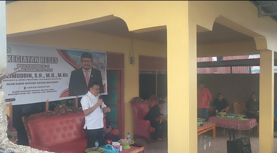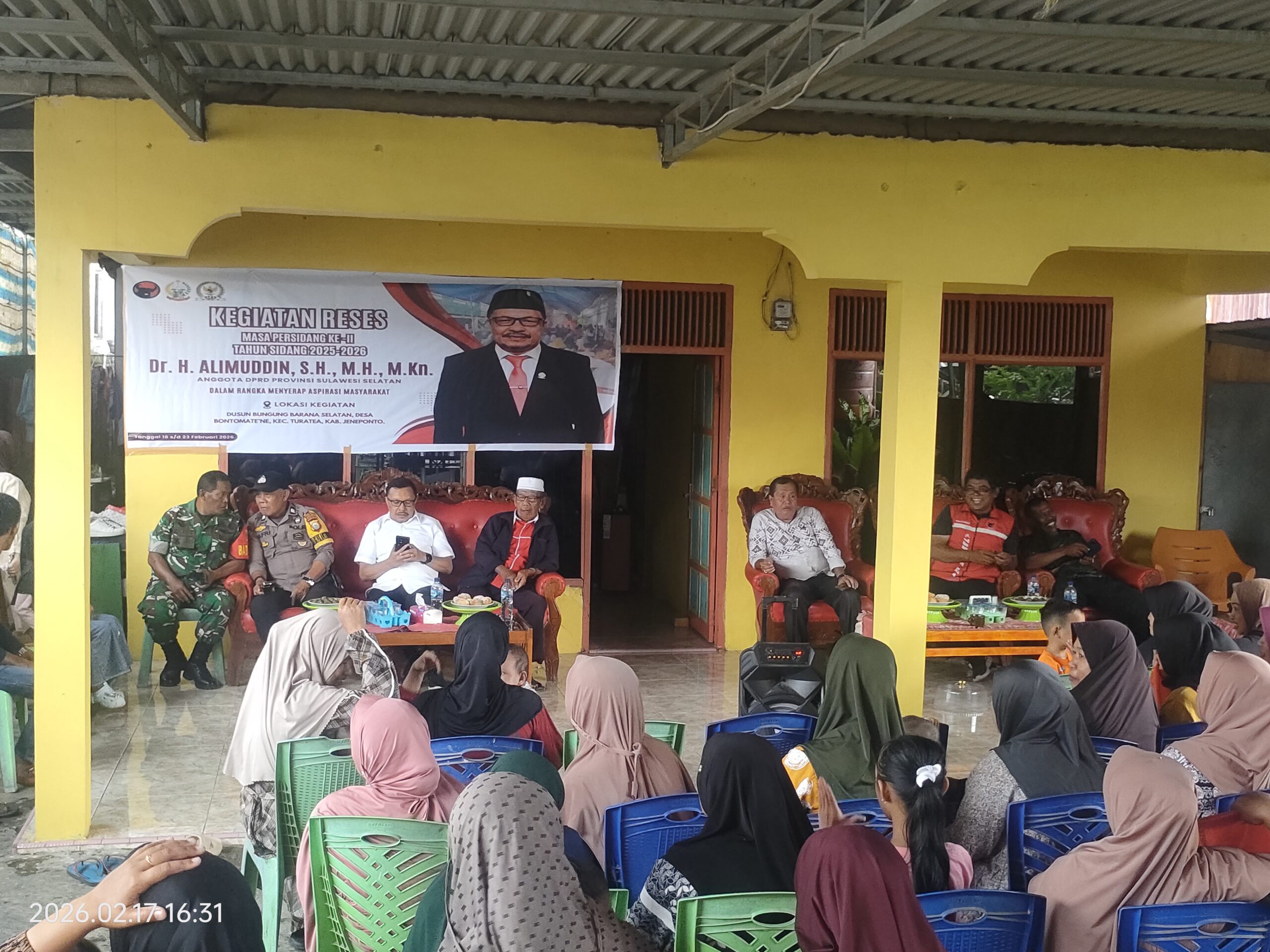 PENJURU. ID | Jeneponto – Anggota DPRD Provinsi Sulawesi Selatan, Dr. H. Alimuddin, S.H., M.H., M.Kn., melaksanakan kegiatan reses masa persidangan ke-II tahun sidang 2025–2026 di Dusun Bungung Barana Selatan, Desa Bontomate’ne, Kecamatan Turatea, Kabupaten Jeneponto, pada 16 hingga 23 Februari 2026.
