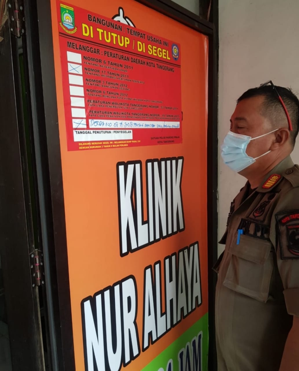 Satuan Polisi Pamong Praja langsung menindak tanpa ragu, dengan cara menyegel, yaitu Klinik NUR ALHAYA, dengan Perda No.17 Tahun 2011 tentang Retribusi perizinan dan Perda No.8 Tahun 2018.