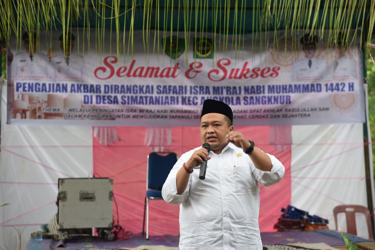 PENJURU.ID | TAPSEL – Bupati Tapanuli Selatan Dolly P Pasaribu saat menghadiri Safari Isra’ Mi’raj, di Kampung Setia Baru, Desa Simataniari, Kecamatan Angkola Sangkunur, Kab.Tapanuli Selatan, Rabu ( 24/3 ). Mengatakan dengan semangat pembangunan yang berkelanjutan, pembangunan jalan dan jembatan di wilayah Tapsel menjadi skala prioritas Pemkab Tapsel.